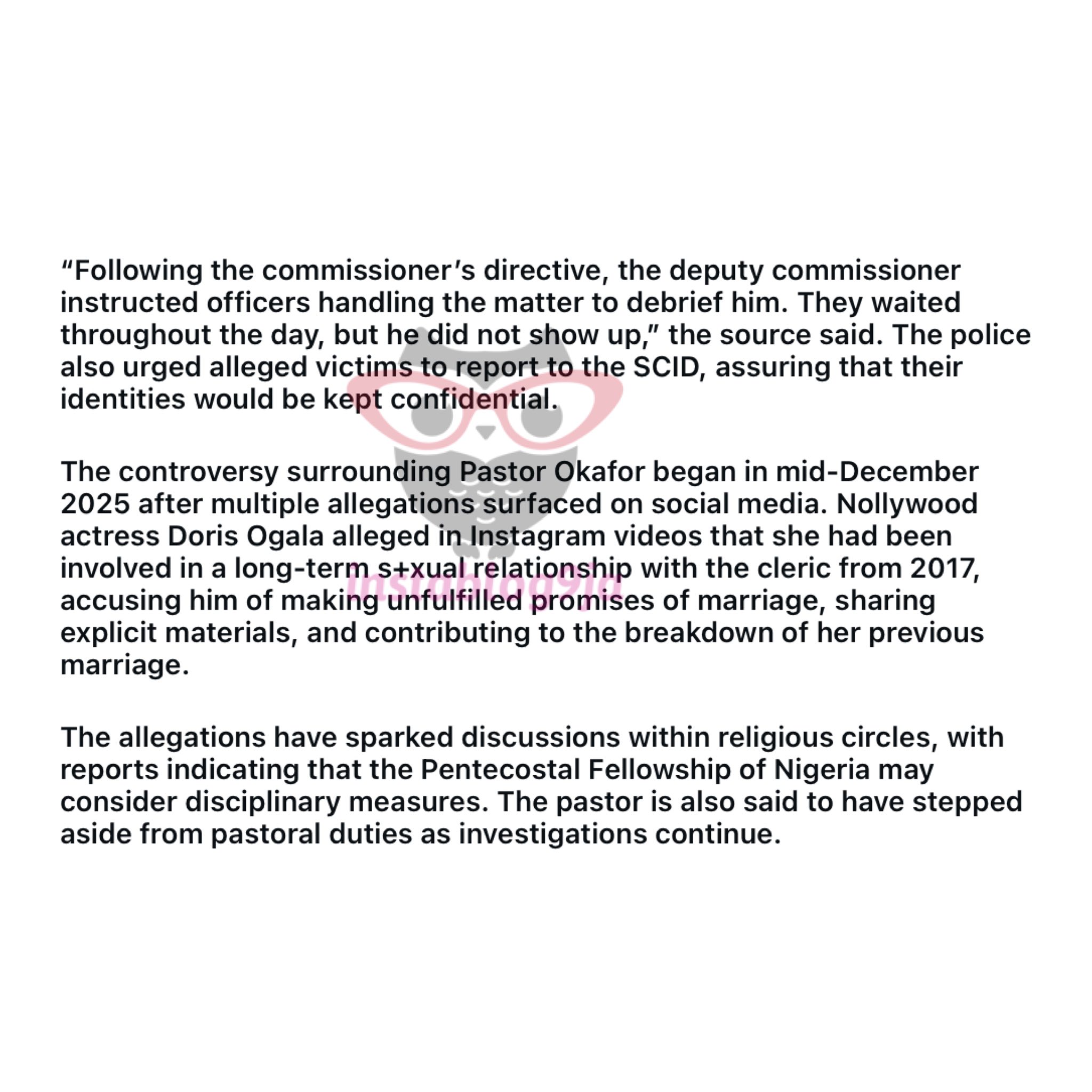 The Pentecostal Fellowship of Nigeria is reportedly considering disciplinary action, while Okafor has stepped aside from his pastoral duties. The Lagos State Police Command assured that security for the alleged victims is in place, and investigations at SCID, Panti, and Zone 2 continue.